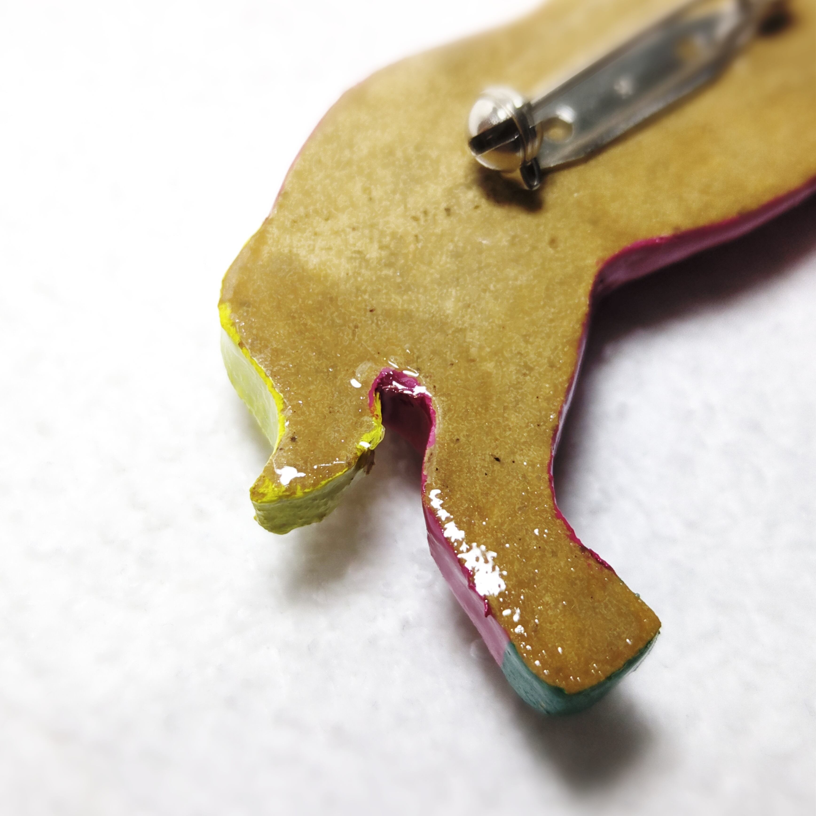 素材:オーブン陶土、アクリル絵の具、UVレジン、真鍮製回転ピンブローチ台